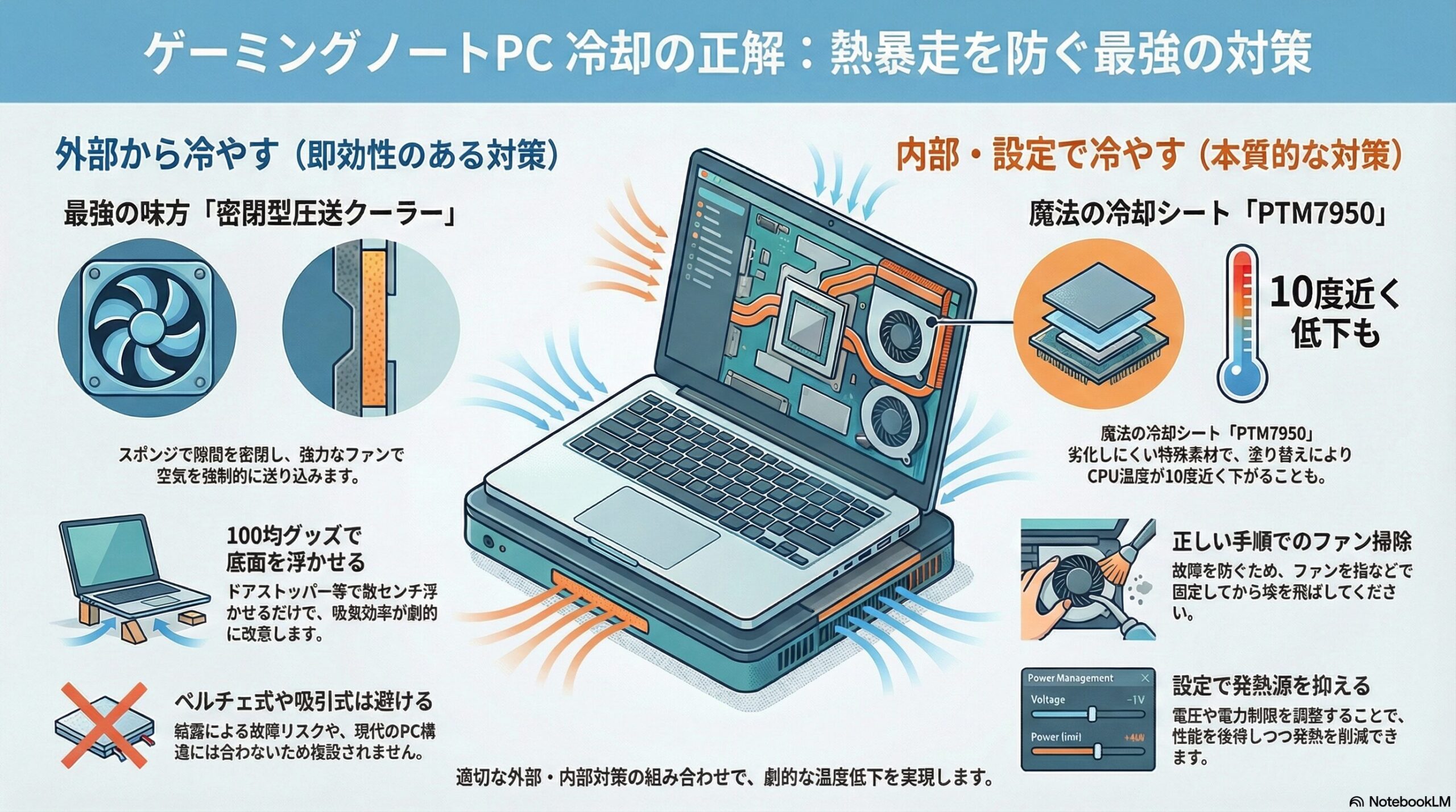 ゲーミングノートPCの冷却を「最強」にするための道のりは、一つの製品を買えば終わりというものではありません。外部からの強力なエアフロー(密閉型圧送クーラー)、内部の熱伝導効率化(PTM7950)、そして熱源の制御(アンダボルティング)を組み合わせることで初めて達成されます。