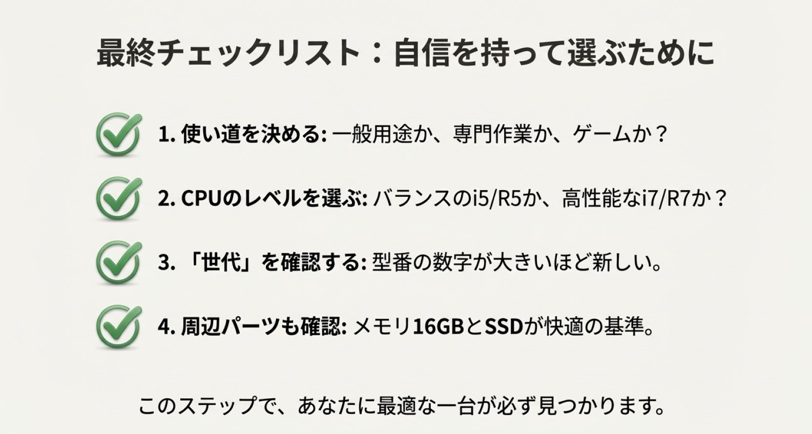この記事では、ノートパソコン選びにおけるRyzenとIntelのCPU比較について、様々な角度から解説してきました。最終的にどちらを選ぶべきか、重要なポイントを以下にまとめます。